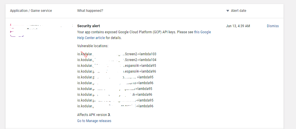 Your app contains exposed Google Cloud Platform (GCP) API keys. Please see this Google Help Center article for details.