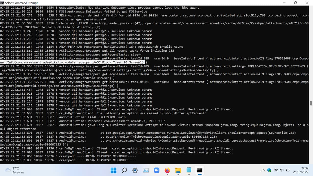 If you want to get logs of only your apps then run adb logcat | findstr {PACKAGE_NAME} and this will show you the logs that contains your application package. Easier to isolate error