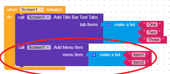I am trying to add items (Item1, Item 2) to menu (About Menu) on screen using following blocks. But it doesn’t seem to work. Any Help shall be appreciated.
