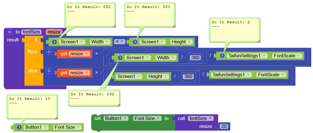 You can make a list all the labels and then under for each item in list loop drag the set font size of label block from Any Component category and then set the font size according to the procedure block mentioned in previous replies.