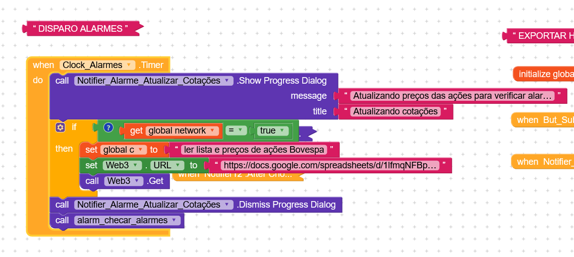 Timer is activated at Screen startup (I use only one screen). Every 10 minutes it triggers the Spinning Progress, updates the stock price and, after that, stops the Spinning Progress with the “Dismiss Progress Dialog” block.