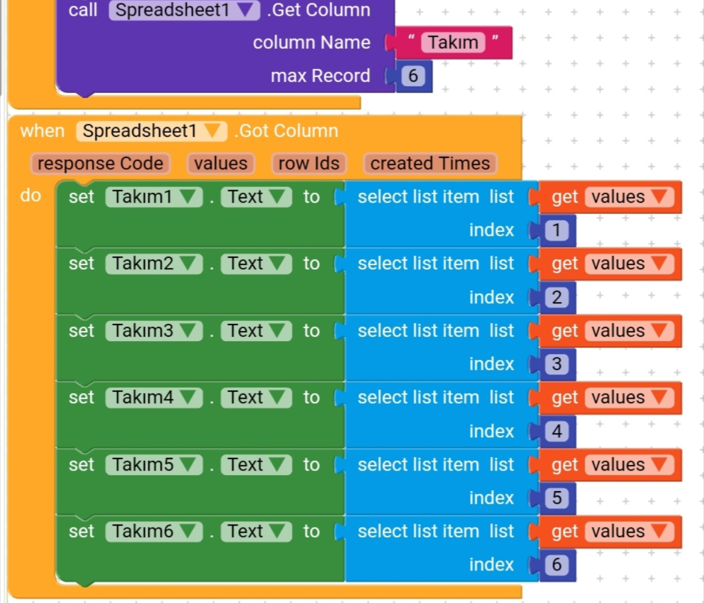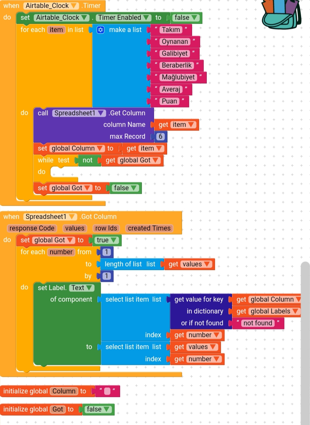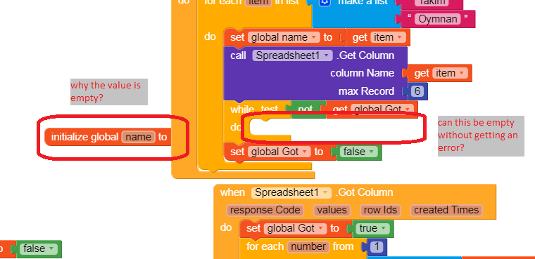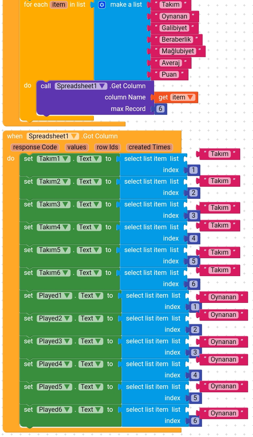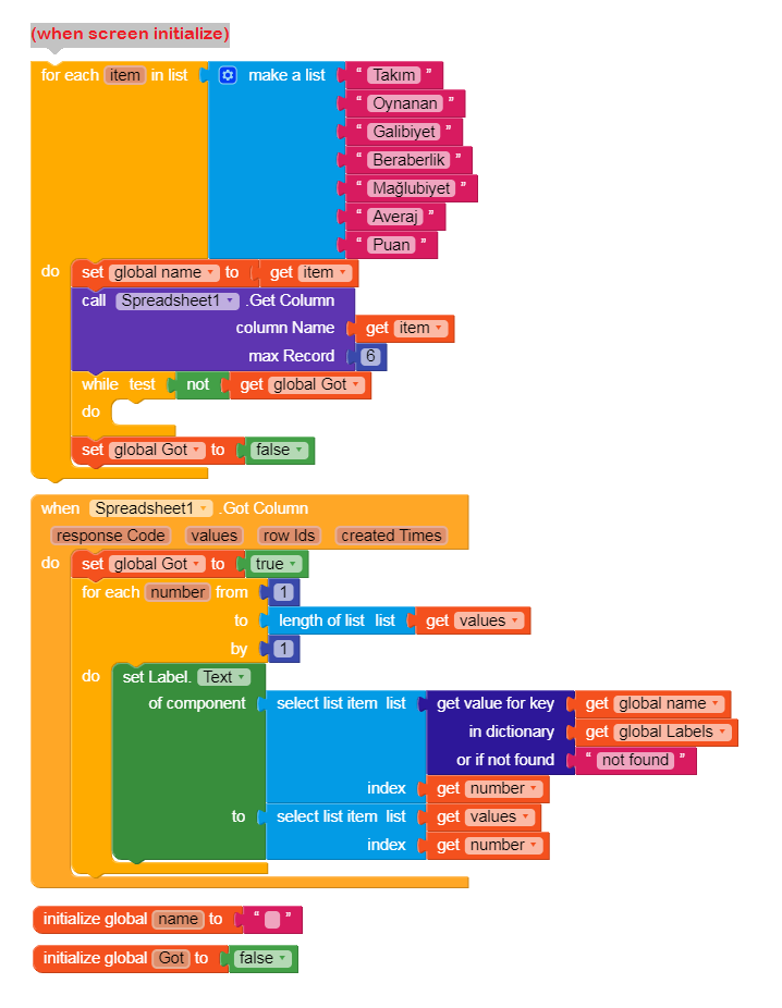 Okay , The label global variable.That variable is a dictionary which have some keys and values.You can increase keys as much as you want.Every key, i have a value which is a list of the labels of that key..Ex.: Takim key has a list of the labels of Takim, etc. the while loop. This while loop is the only way if found to stop executing the loop until airtable gets the data.Then it starts executing the next item in the loop. So i have a variable called got which determines that the app gets the data or not. ( when airtable gets the data it will set got to true ) when got equals false it stops the loop from executing..When got becomes try it returns it agian to false so no error occurrs and the starts getting the next item