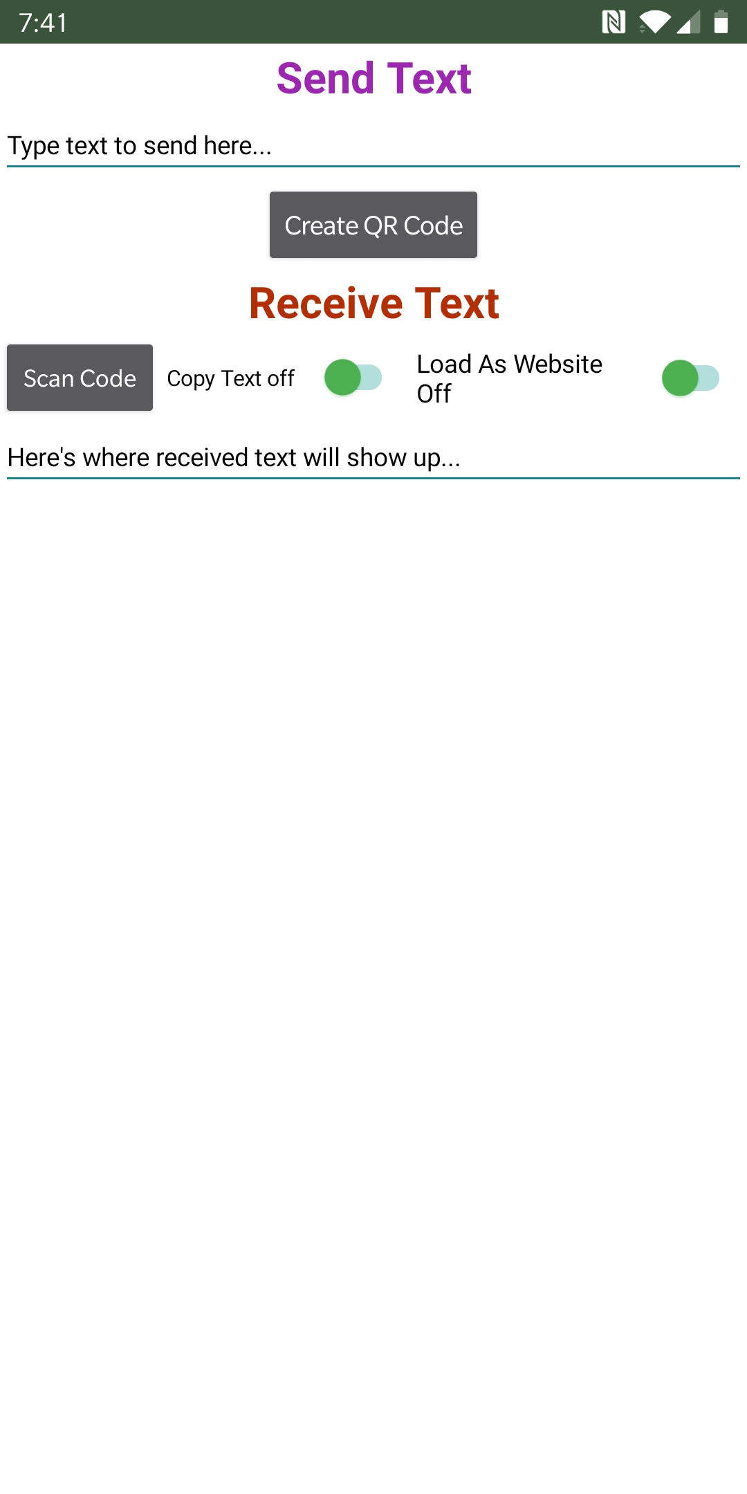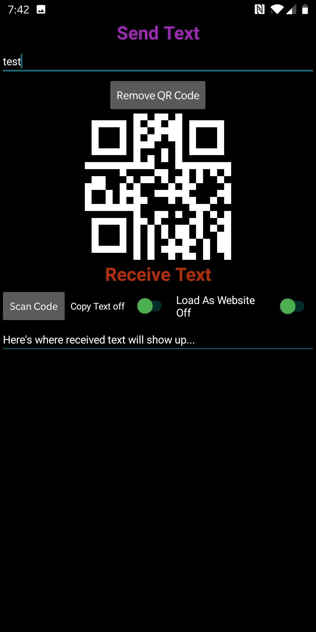 I made a simple app to send and receive text via QR codes called Local Send on Kodular. When receiving text there is the added option to automatically copy the text or attempt to load it in a web-view. It is available on the Play Store at this link: https://play.google.com/store/apps/details?id=com.simpletoolsmadeeasy.localsend3 and here is the APK localsend1.2.0.apk (5.1 MB), as well as the AIA: local_send (1).aia (28.6 KB). Currently QR codes cannot be generated without an internet connection but I may be able to fix that based on the suggestion provided to me here: Generate QR Code Without Internet.