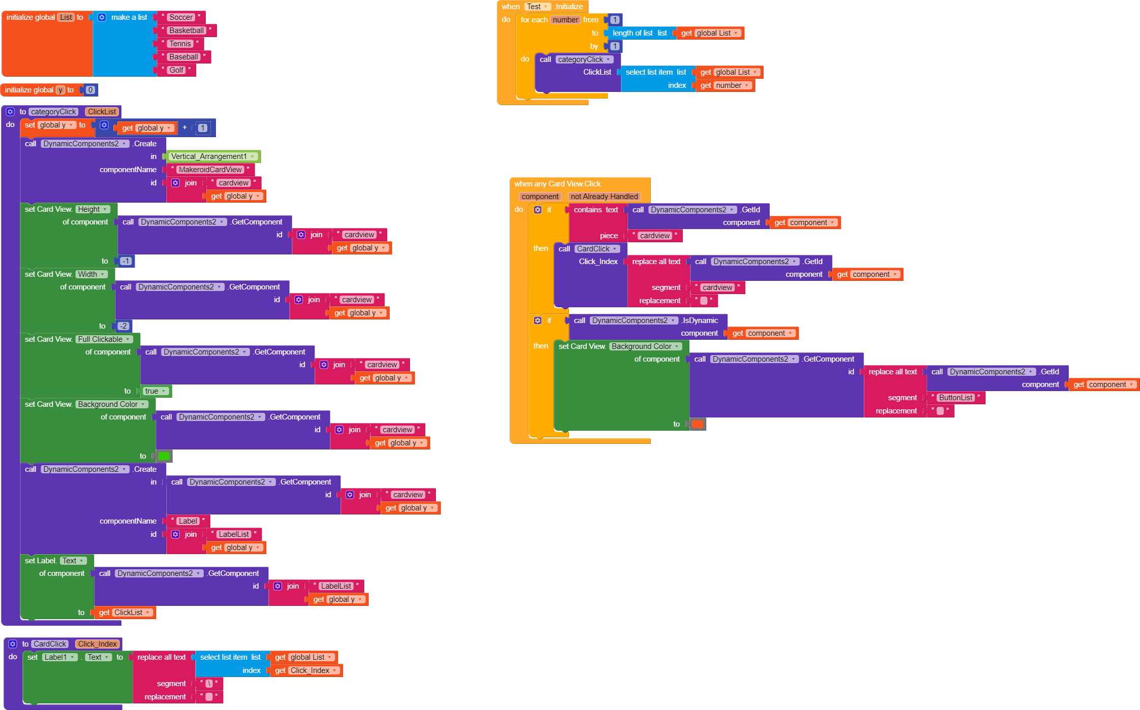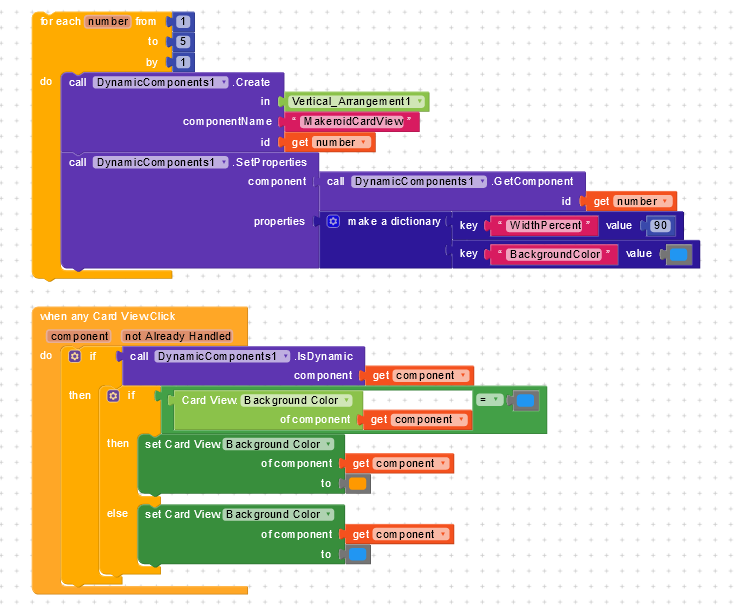 Kindly check my block and with video. Try to change background color when any card view click through Dynamic Components Extension but i failed. This block worked when i click first time in any button, but during the next button click, the previous click button color not change to default color.