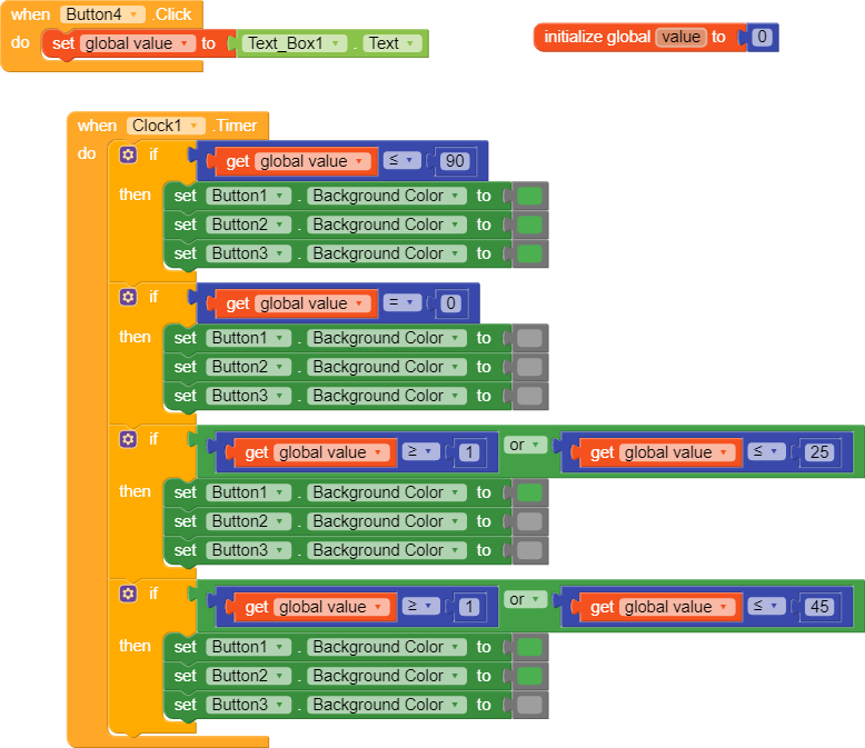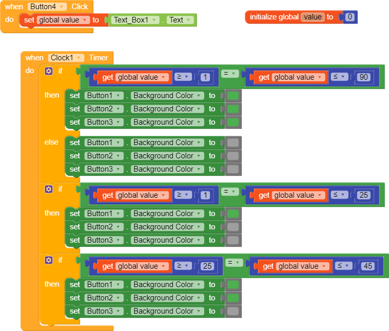 In most cases (like 83), the value was below 90 and above 1. So it set button1, button2 and button3’s background colour to green and two other conditions set background colour to gray of all buttons.
