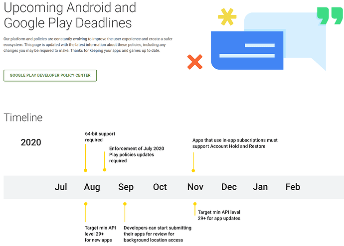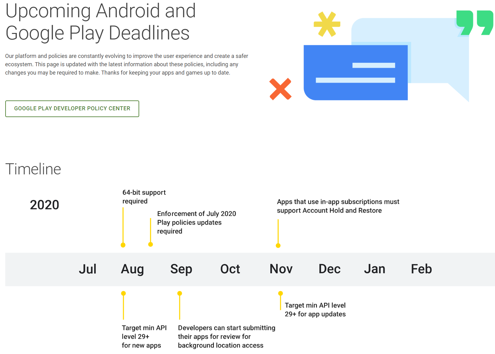 By August 3, 2020 , new apps must target at least Android 10 (API level 29). By November 2, 2020 , all apps that are being updated must target at least Android 10 (API level 29).