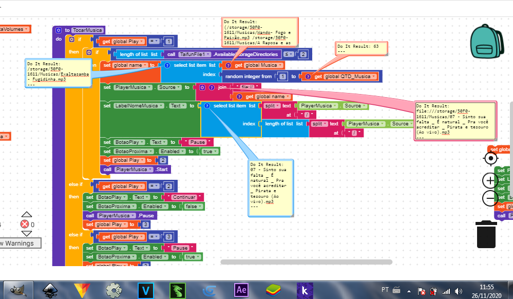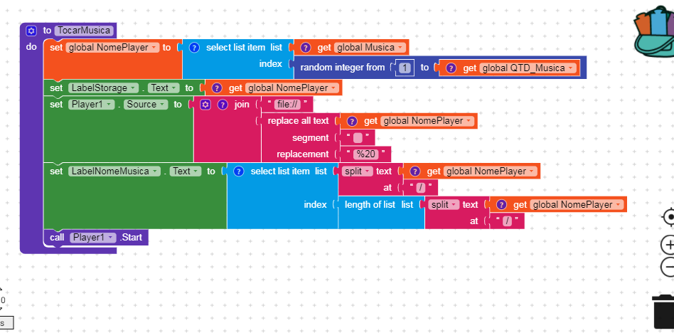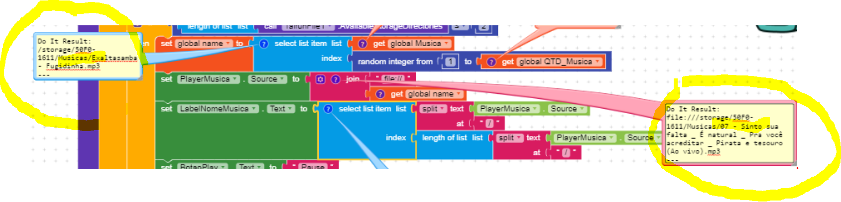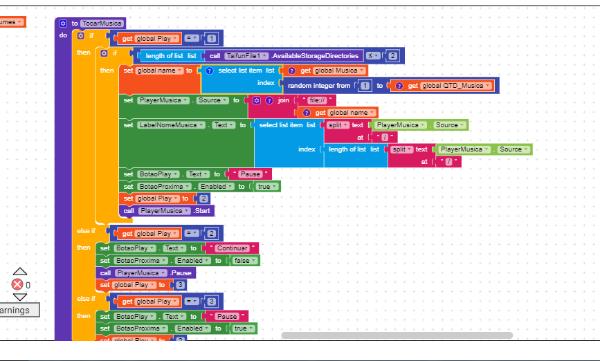 Just to summarize what I did: I created a variable that receives how many volumes there are on the device. Then I created another variable that receives data from the Taifun extension, and instead of the “dir” parameter I select from the list of the variable I created, the index and add the text “file: //”. When AfterFIleAsync runs I only add the rest of the files, if any, to the list. The part of the player that gave me so much headache, I’ll show you below.