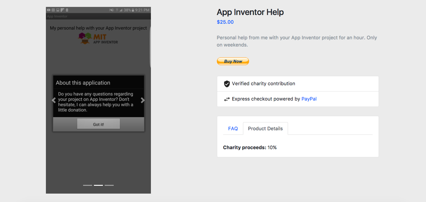 - Verified charity contribution - this means, that some money out of the price will be donated to a charity, crowd funding goal. In this case, I am donating that money to MIT’s App Inventor for iOS Crowdfunding Campaign. To see how much percents will be donated, please check Product Details tab.