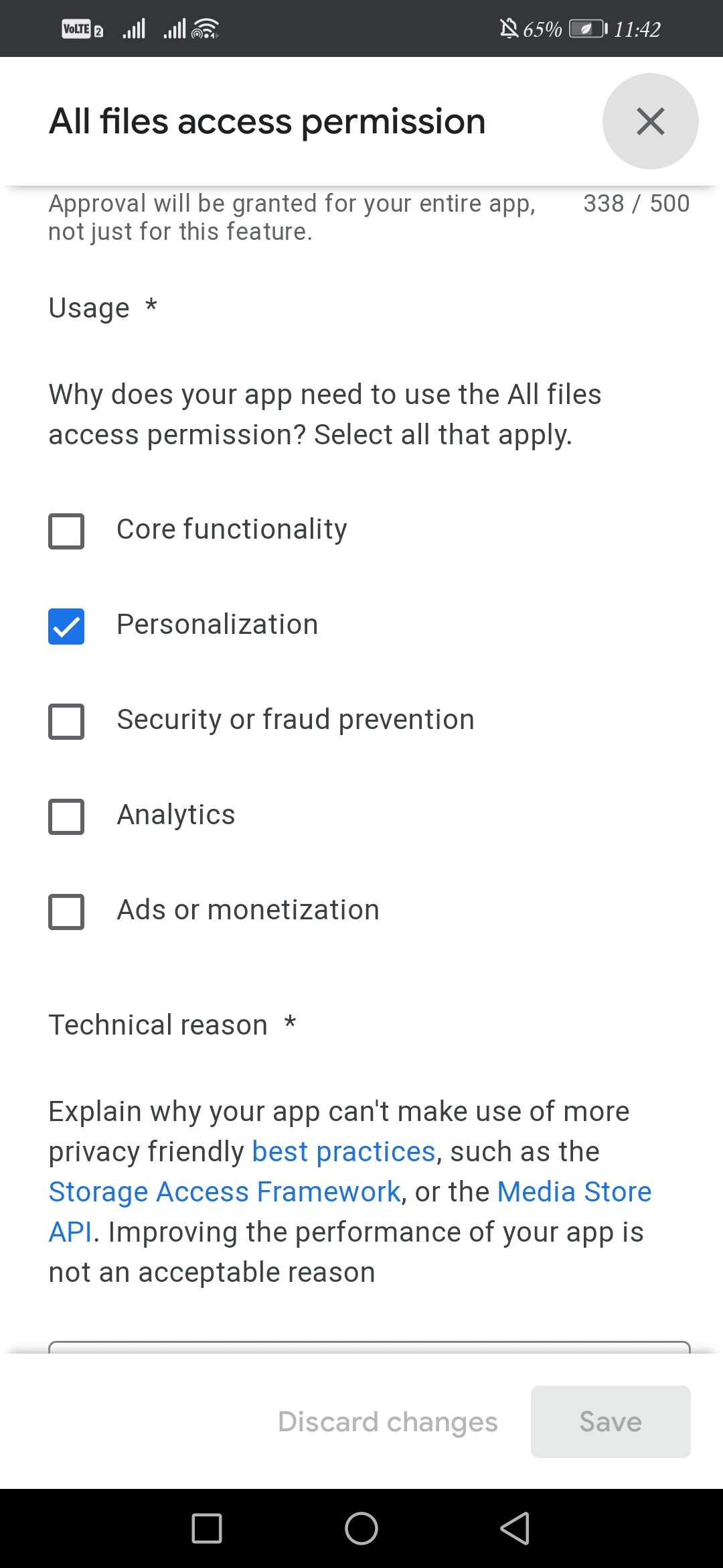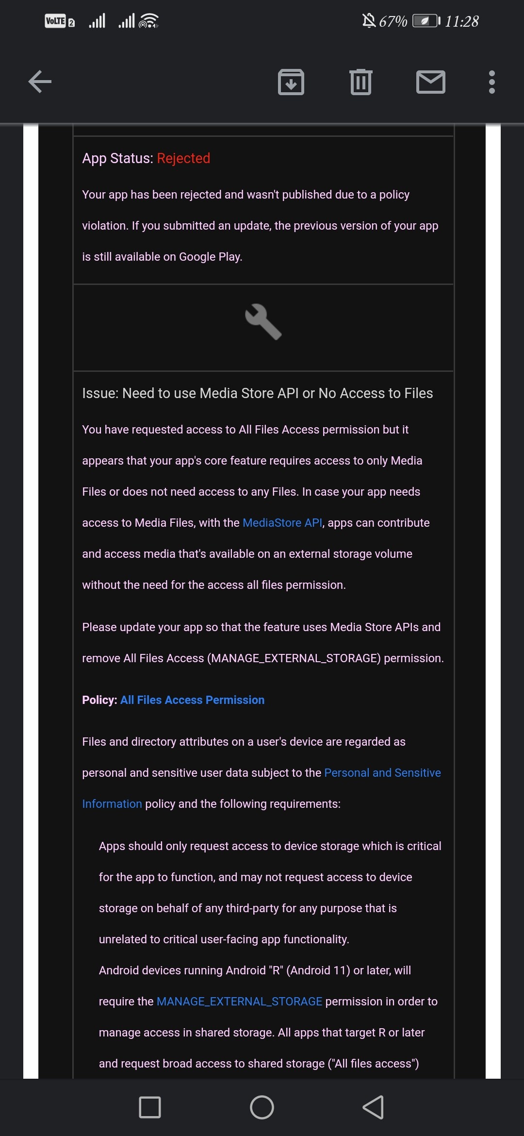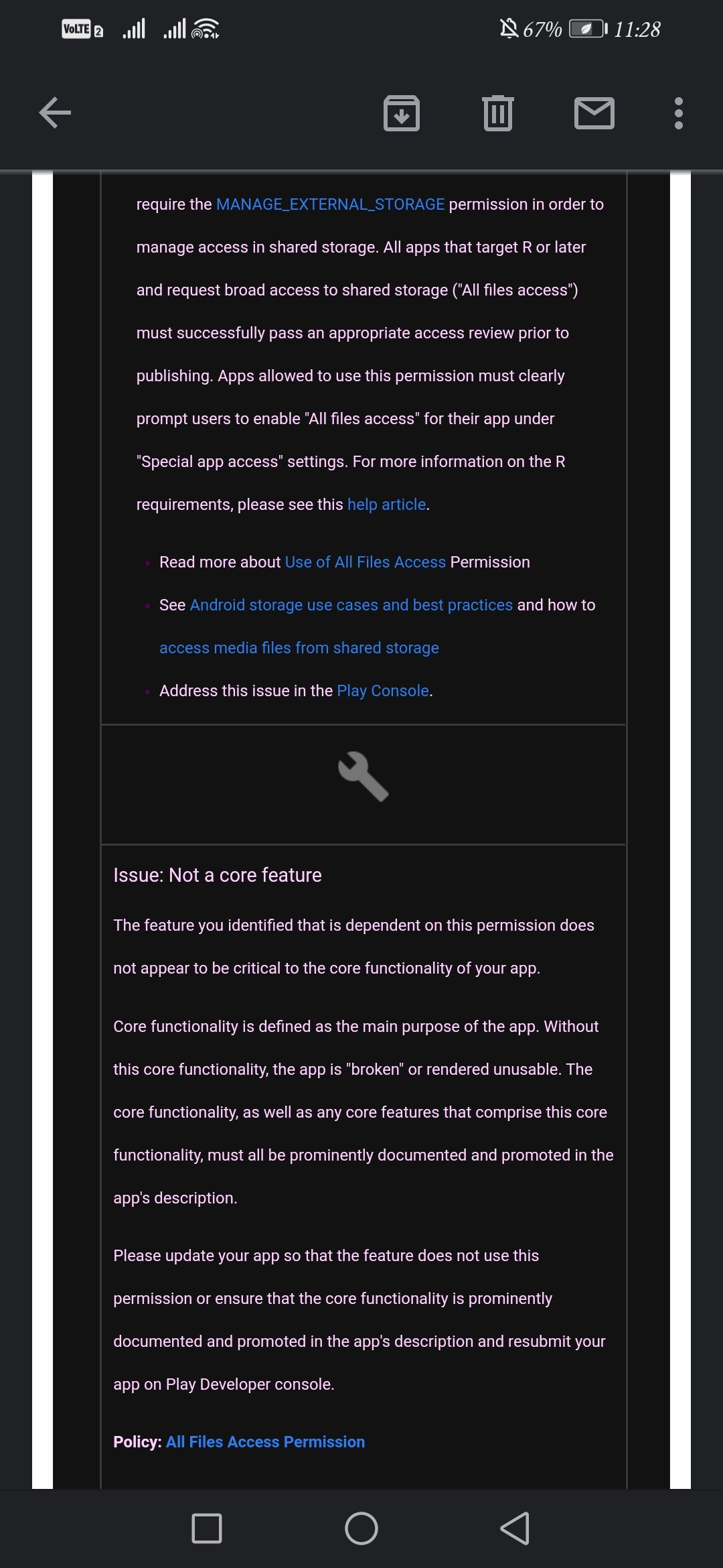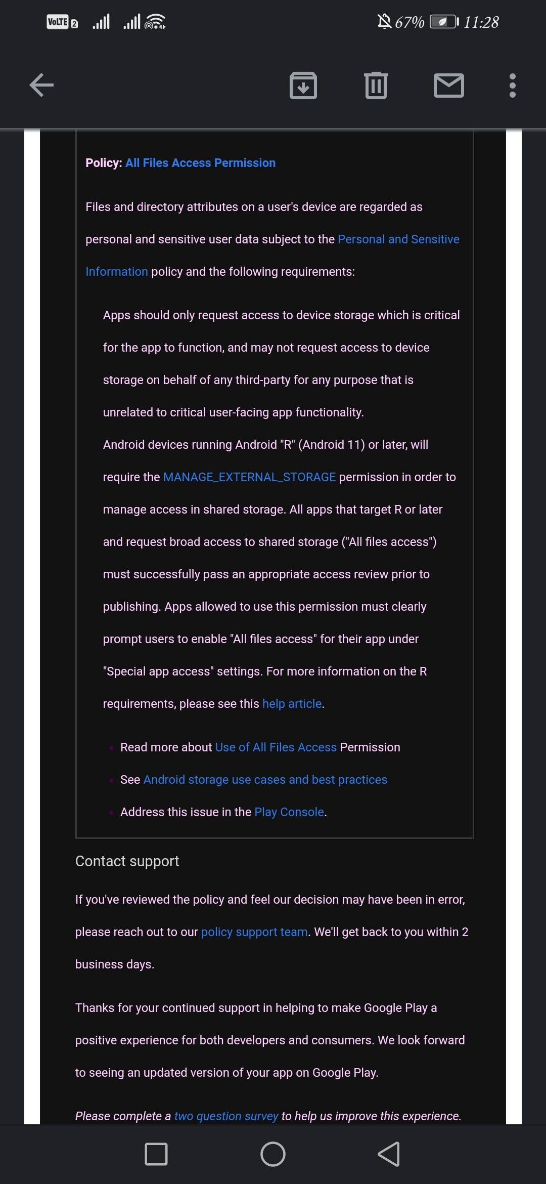 I have created an app where I have taken External Storage permissions in the app … but my app has been rejected from the play console …