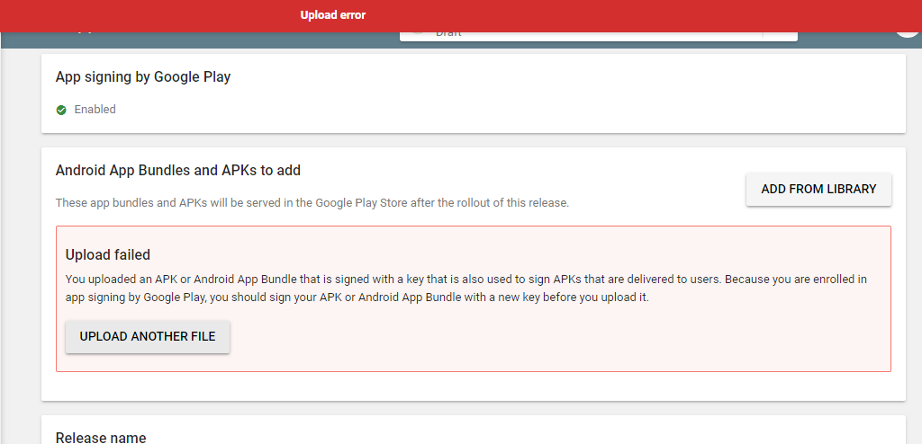 I just tried to publish an self developed/coded app (not any imported .aia) on play store. After app signing by google play i tried to upload my APK in the said folder. After completion of uploading an error pops up saying: