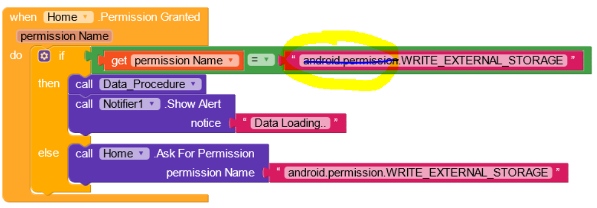 but in this case the block queries if “name of permission=WRITE_EXTERNAL_STORAGE” is true.