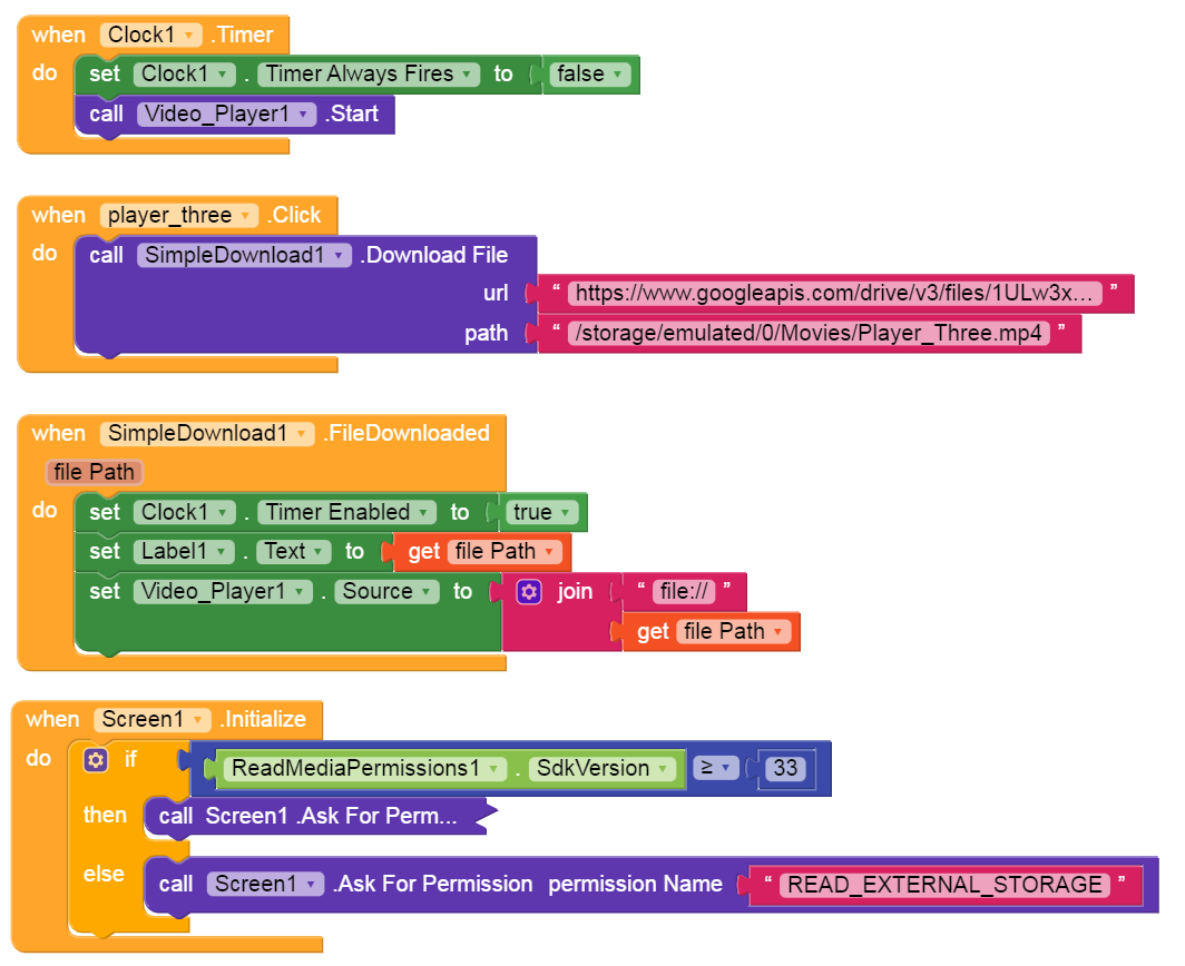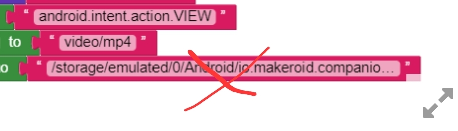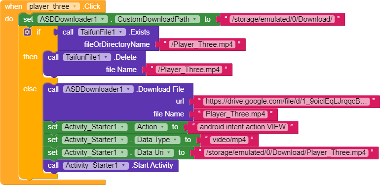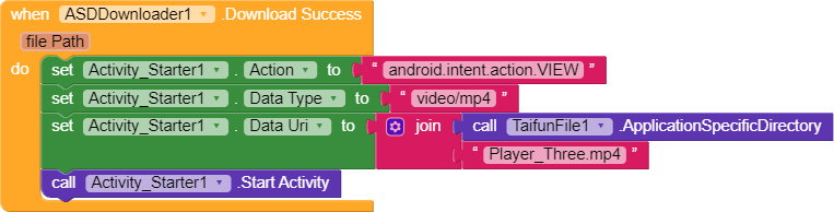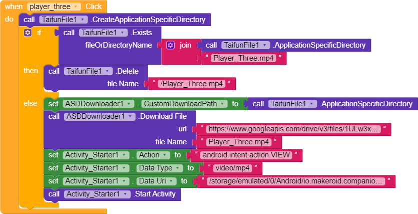 thanks but no luck-I changed the blocks (removed and placed action, event, etc and added to after download complete, but does not play. also tried with just the app specific block, then tried to join the app specific block with file name (Player_Three.mp4), also tried /Player_Three.mp4 in file name in activity starter/data URI suggestions? test.aia (80.2 KB)