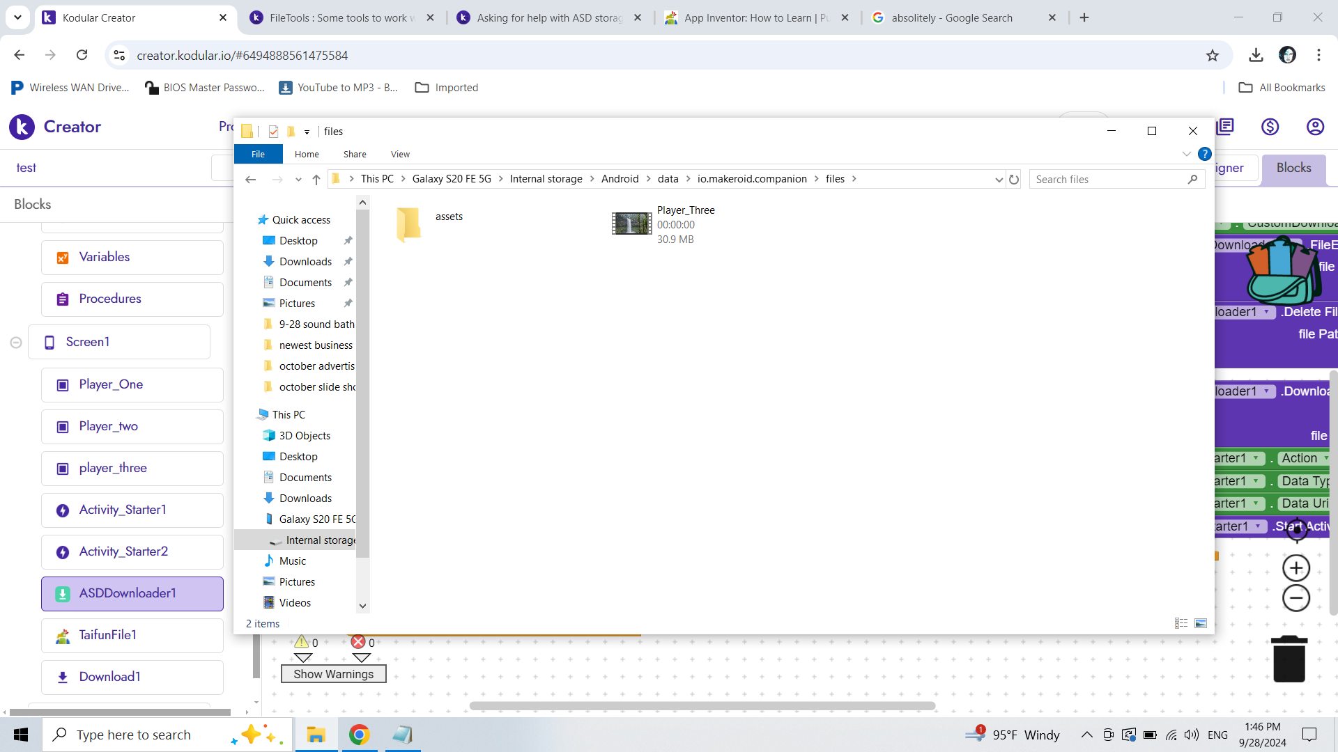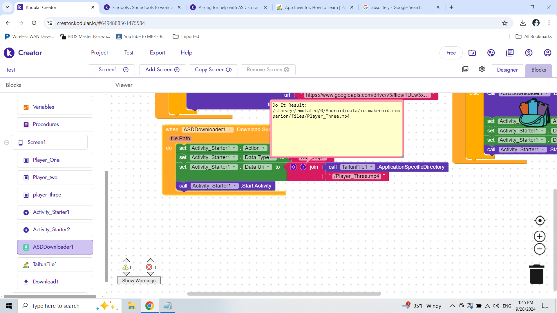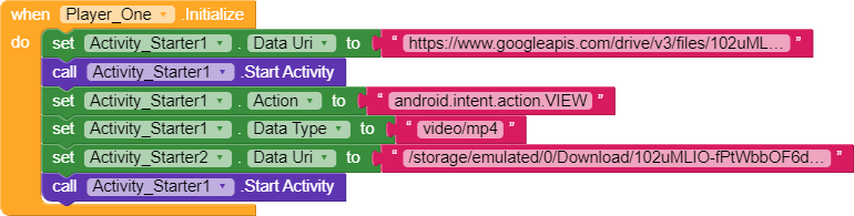 do work for the android 13 version, although there is a 602 error due to 2 activity starter blocks, but when added in this fashion, after error disappears, The mp4 “streams” in and is never saved to the device, but when i attempt to run this apk on the android box (still a 602 error), it opens a web browser, similar to the web view component, shows the file being downloaded automatically (due to integration with google drive api), but then requires interaction by clicking on “do you wish in install this?.” default KD player then plays mp4 on android box after clicking yes. i can remove this 602 error simply by adding a second activity starter, but what i am trying to show is that from the root storage, it is possible to play/stream immediately an mp4, but can never change that file name/delete/over right, etc. due to android security with deleting files. thats why i am attempting instead with asd to get this working. does not seem that the activity starter can start events if they are stored in a asd.