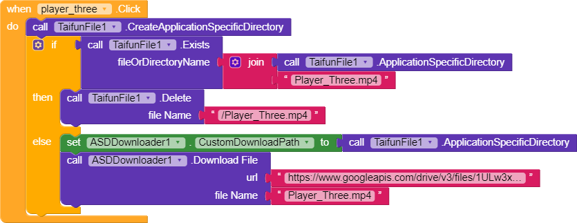 By the way, the reason I thought to play the file before it has completed the download is that these blocks do allow the download to be played (at least on android 13 phone) before it has completed. this method, as long as google drive has a API associated with the URL, the mp4 actually “streams” into and is never downloaded, but cannot change file name, etc. so looking for the asd method instead.
