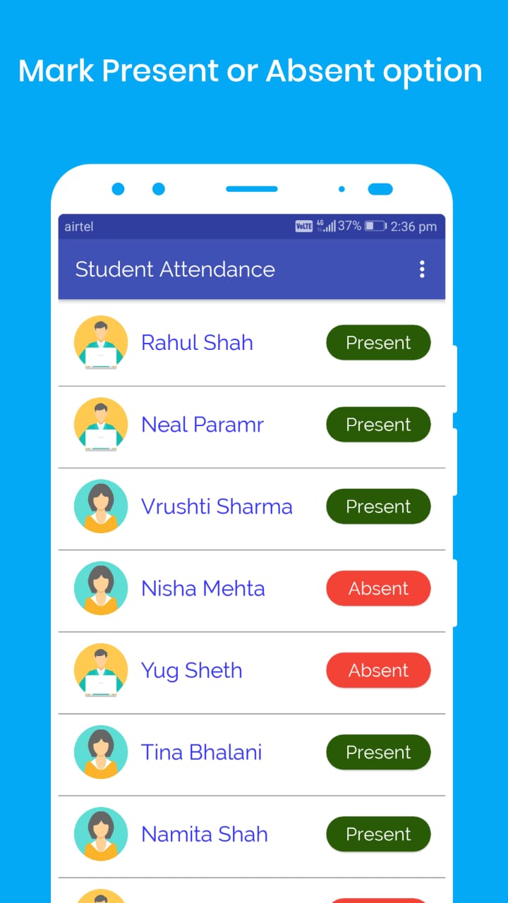 i have one suggestion instead of showing a popup for marking present or absent make two buttons in list one for present other for absent and remove mark button it will become more user friendly