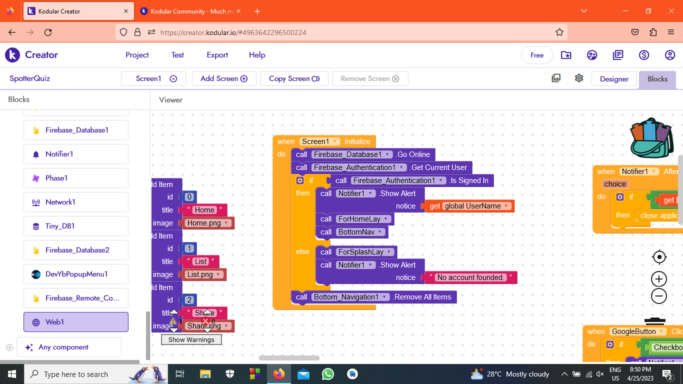 I tried this before, spinning progres cannot be dismiss from firebase tag list.It is working in Niotron but not working in kodular.