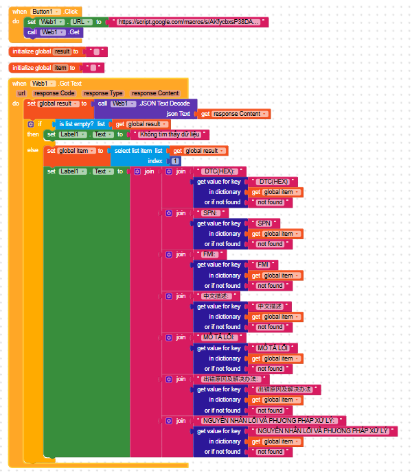 I created an app to search data from Google Sheets, but it shows an error when I download and use it. Could you help me identify the cause?