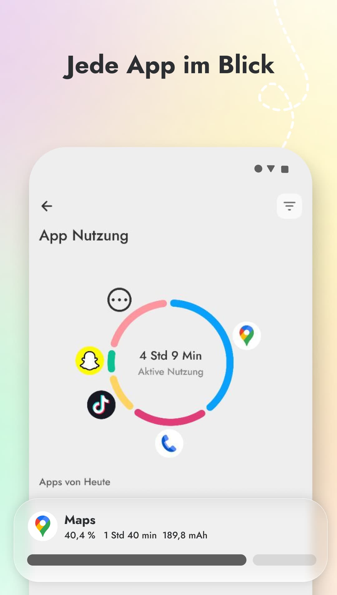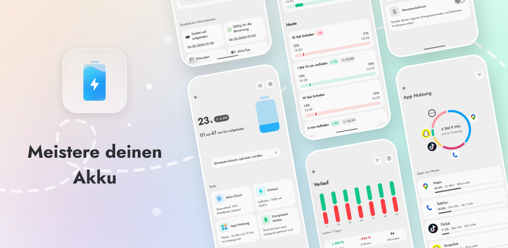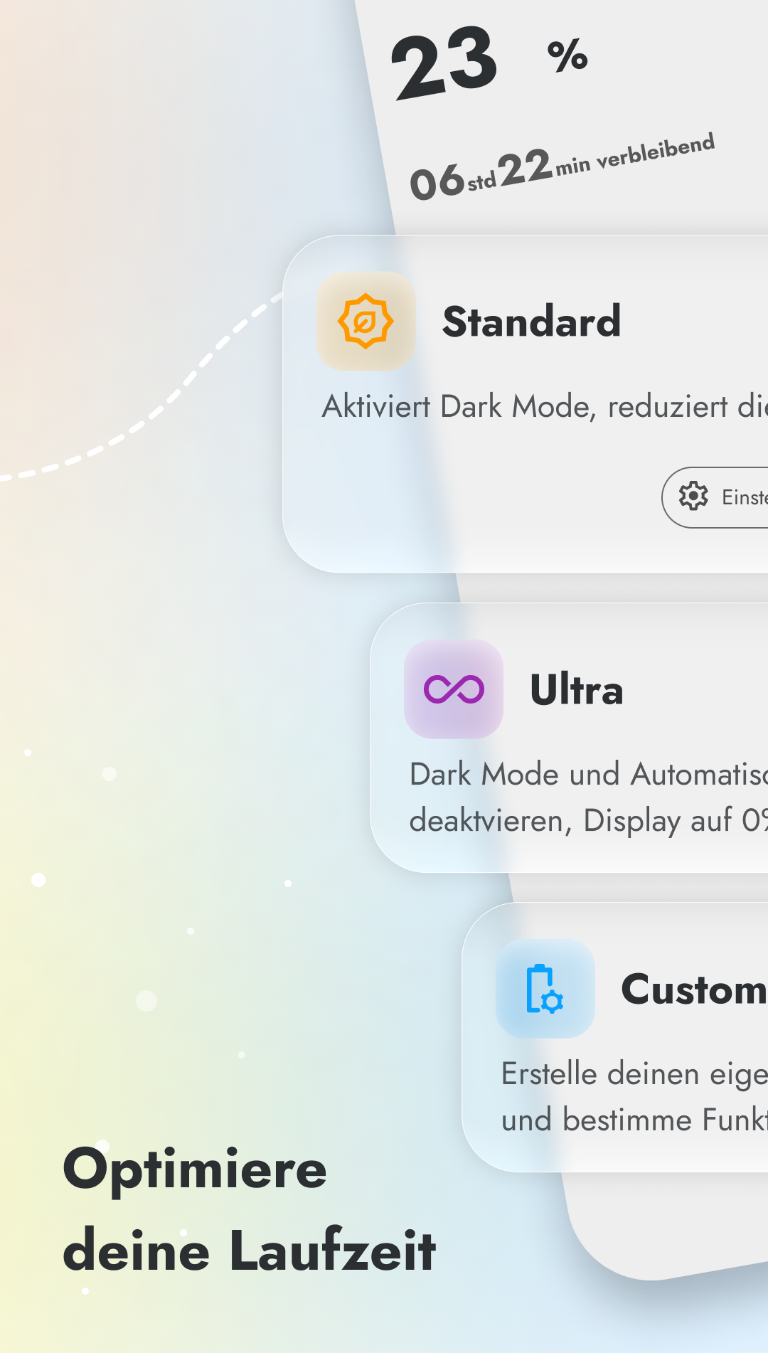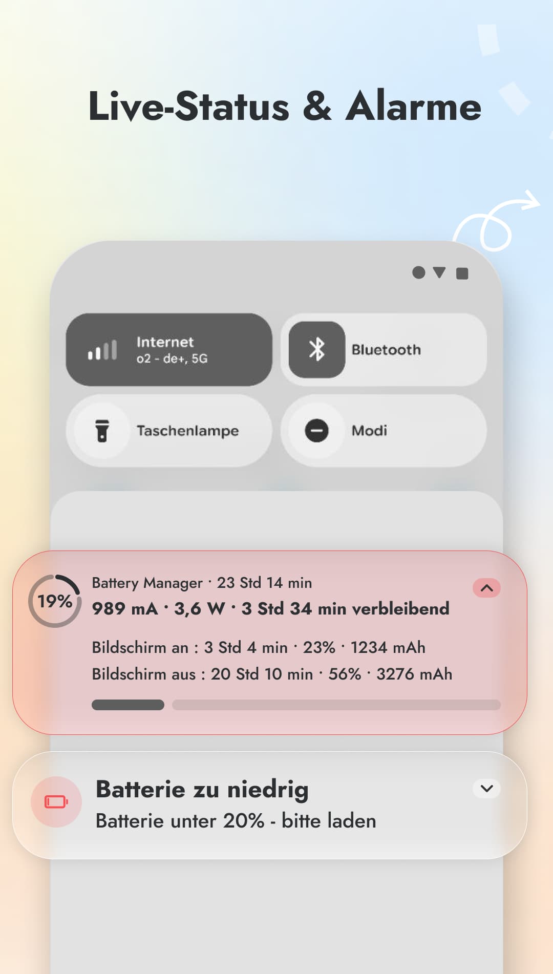 Optimize battery use with just one tap, and identify and fix battery problems. With “one click optimization”, battery-discharging services such as WLAN, Bluetooth, brightness, screen timeout, location are deactivated according to the user settings. This can help reduce battery consumption.