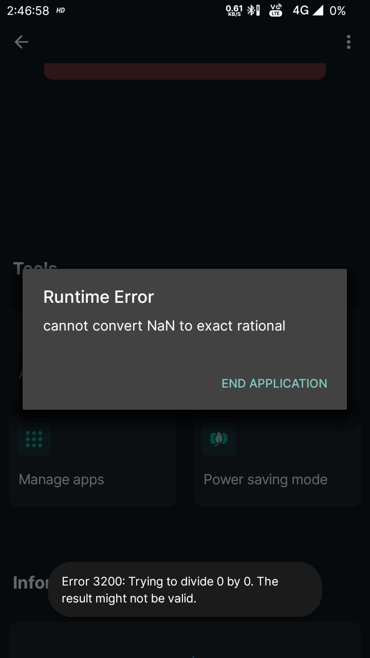 and because the 0% cause an error, the further codes are not executed, when scrolling down, my app tries to create a chart, but there is missing data on it, which was not completed by the error.