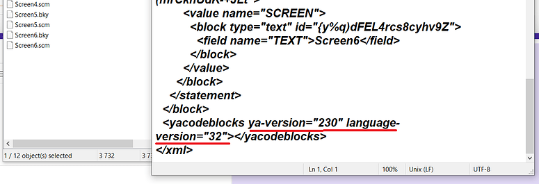 Then download aia, open archive, locate problematic screen’s bky file and edit it. Scroll down and replace ya-version="230" language-version="32"