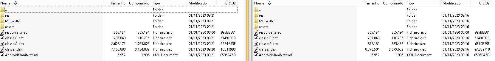 The left one is the apk that works. Notice original size difference of class.dex and class2.dex between results. There are other files with different sizes.