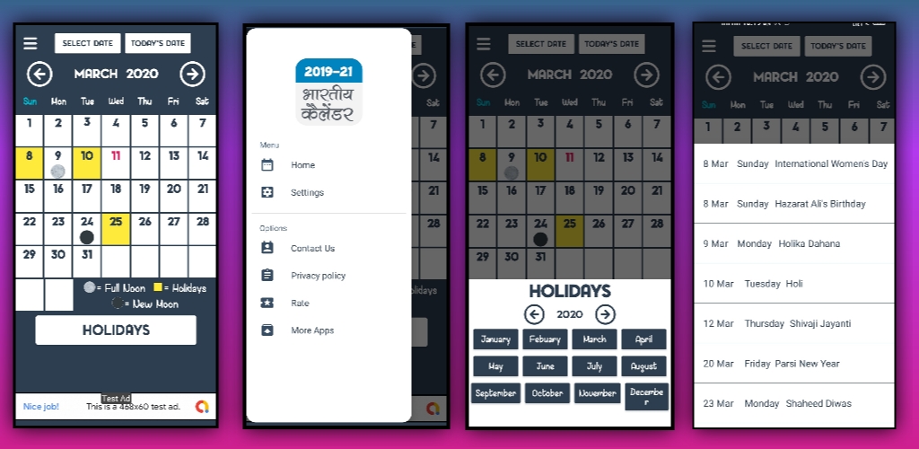 - Shows new moon, Holidays and full moon