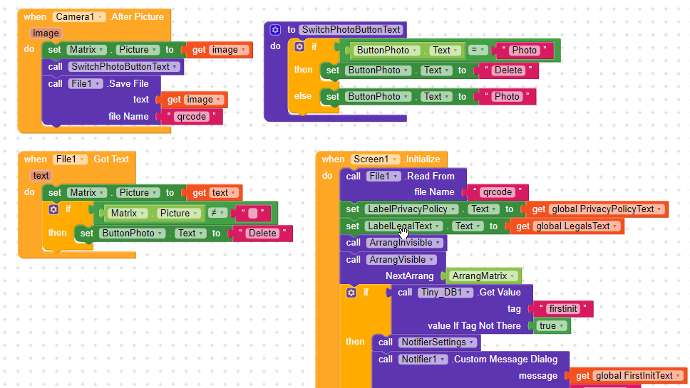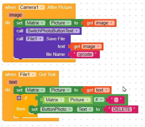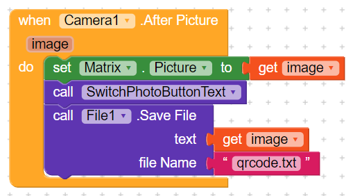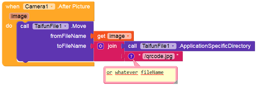 Nope.That isn’t what we mean.You can’t save it using the file component.After Picture event means that its already saved.And you can’t save it again.What you will make is that you will just rename the photo saved from its path ( you will get it in the image variable ) to the new file name using file tools extension.You can set the old file name as the image variable And set the new file name to qrcode.png for example.And whenever you will need to set an image to you will use set image property to the new image path. ![]()