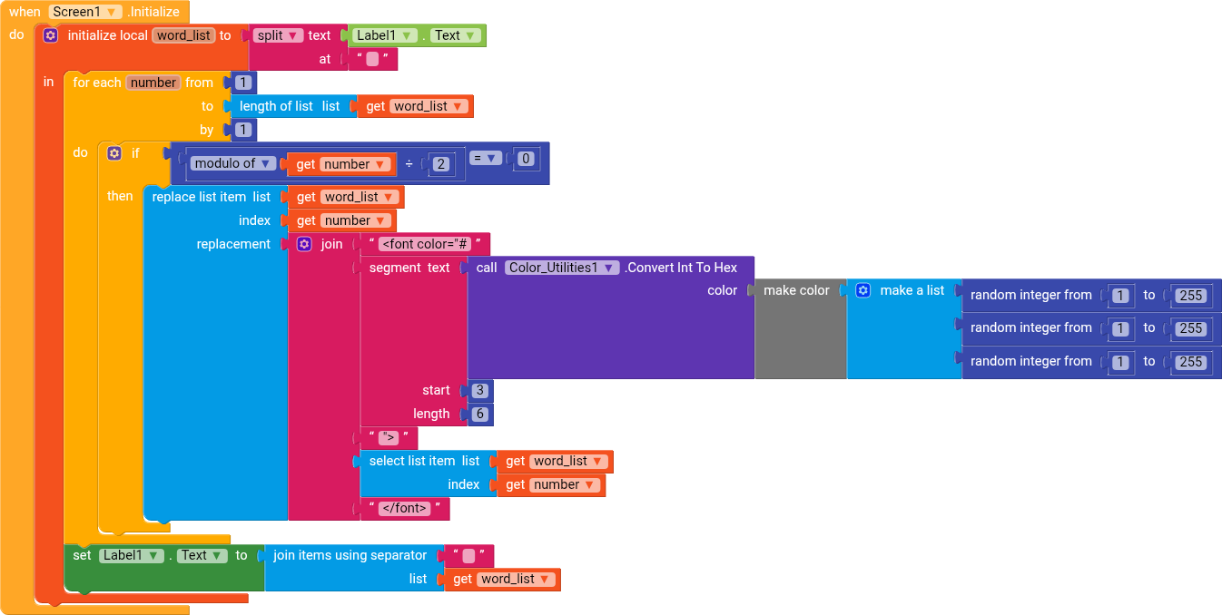 In a Label, I want the text to display in such a way that the words at positions 2, 4, 6, 8, 10… (every even word) should appear in random colors.