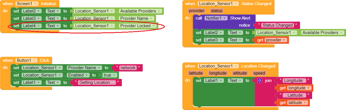 The location sensor component’s provider seems always to be GPS, even though I explicitly set the “Location Sensor”.“Provider Name” to “network” (as the “Status Changed” event of the “Location Sensor” was never invoked). While I can do this using similar blocks using App Inventor.