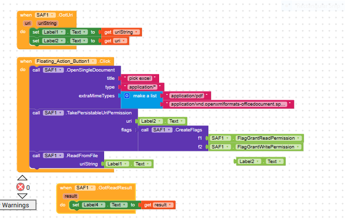 the “get read result” block sets label 4 text to (( No content provider:text for label 1))