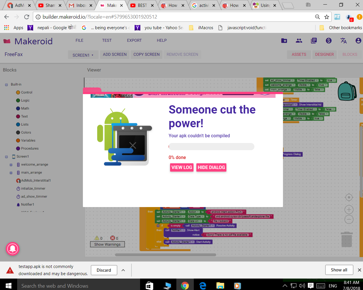 When I try to export apk, It shows “Someone cut the power! Your apk couldn’t be compiled”