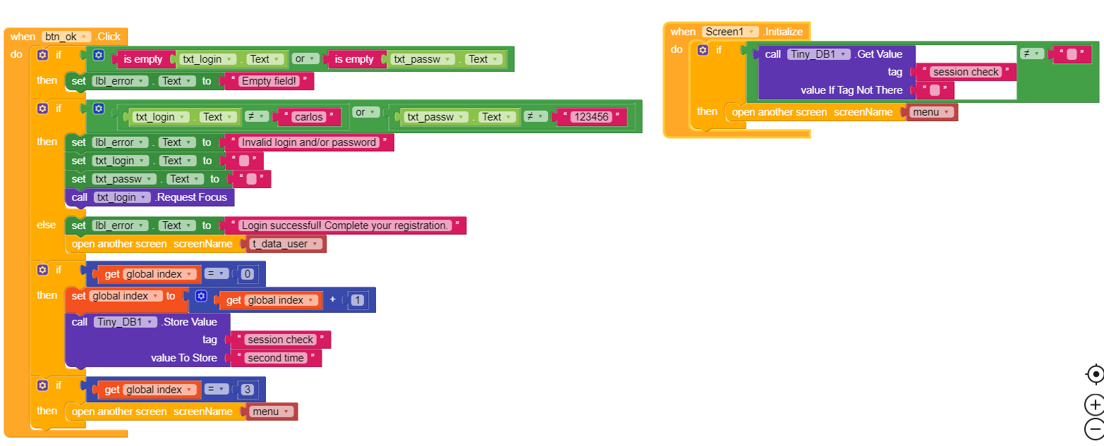 In this small test menu, I created a login screen, a data user screen and a menu screen. I couldn’t proceed because it’s the first time I’ve done it and I didn’t search the forum because I don’t even know what title it would be for.