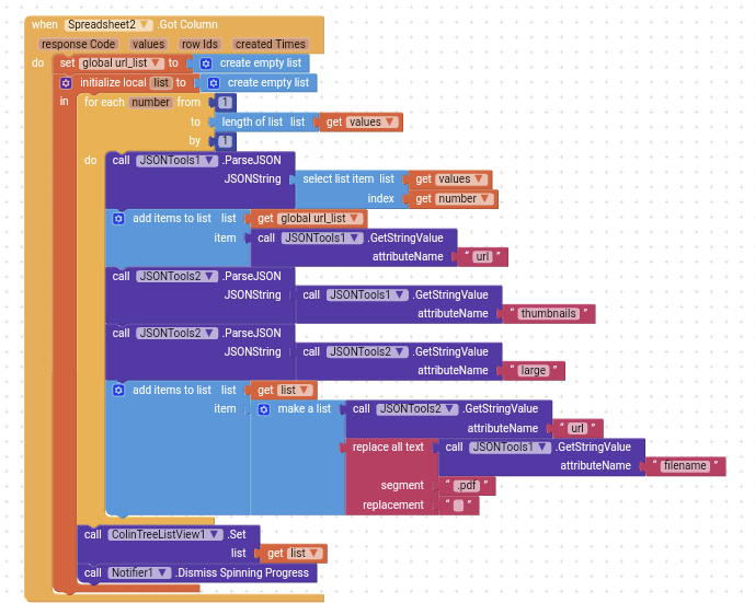 You get response in json format only when you are using get all rows block with when speadsheet got all rows block but here you are using column and when spreadsheet got column block so most probably the values that you get are not in json format but just a list. Can you use Do it to debug your blocks ?