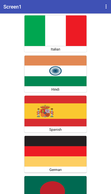 In my method, I used CardViews (FullClickable) containing an image and a label. Each CardView, when clicked, saves a value corresponding to the flag in TinyDB under the tag "lang" and opens the corresponding screen.