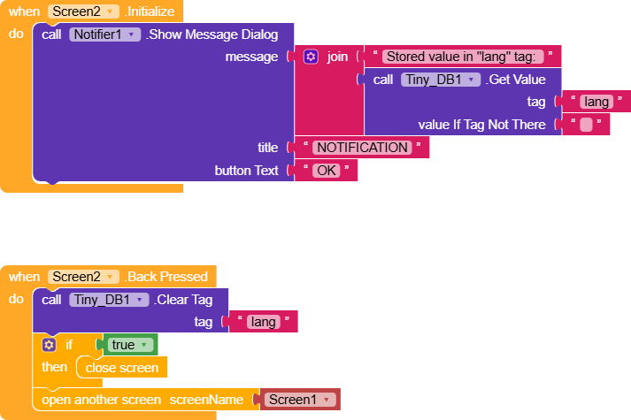 Screen.Initialize runs, we simply show a notification displaying what’s saved in the tag.Pressing Back clears the value from the tag and properly closes the screen, this avoids a loop where closing Screen2 would make Screen1 detect the saved value and reopen Screen2.