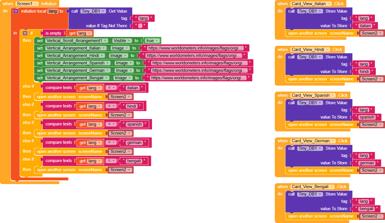 In Screen1 we have several CardViews, and for each one a different value is saved under the tag lang.