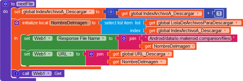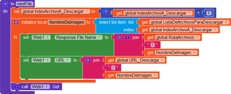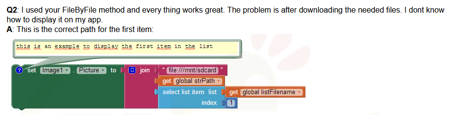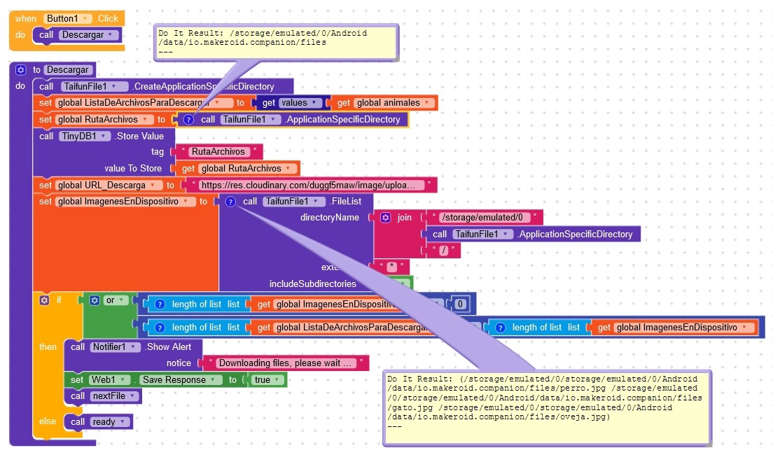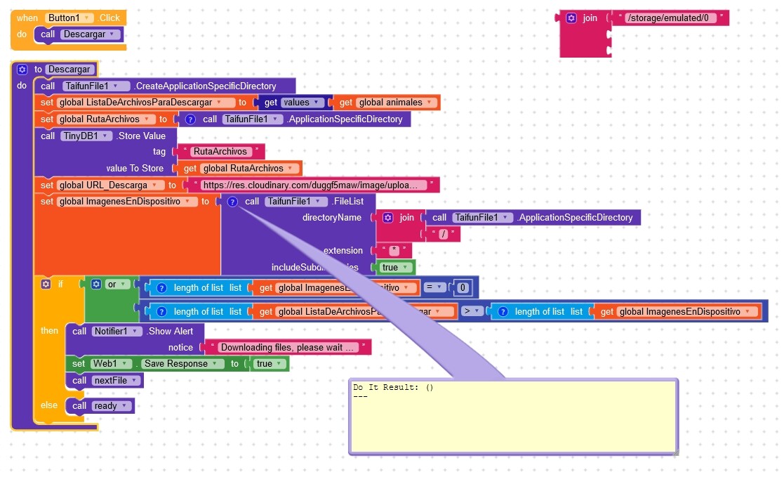 This is the block to download the images, without the /storage/emulated/0 at the beggining it doesn’t find any file after downloading (this block is used to compare the files already downloaded and the ones on the list of files to download to perform the download if there are more files in the list than the already downloaded).
