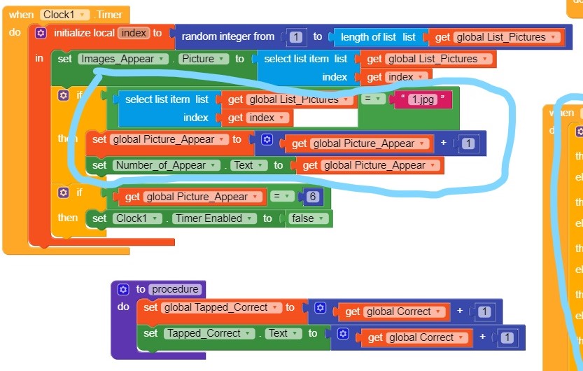 A timer component is showing pictures on the screen whenever it is fired from a list of pictures, and an increment of 1 “global Picture_Appear” is done whenever the picture appears: