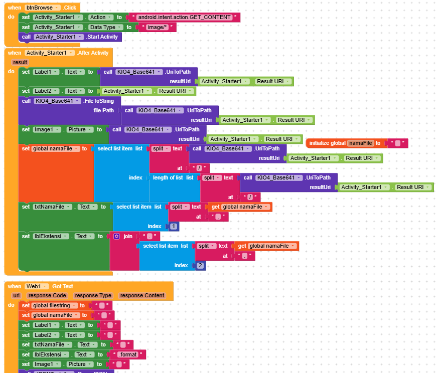 ![The image shows a block-based programming script where clicking Button2 sets a label to ‘Loading’, requests permission to read external storage, and uploads media using a file name retrieved from the activity result URI.