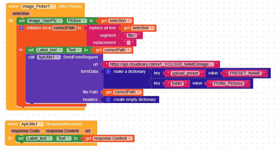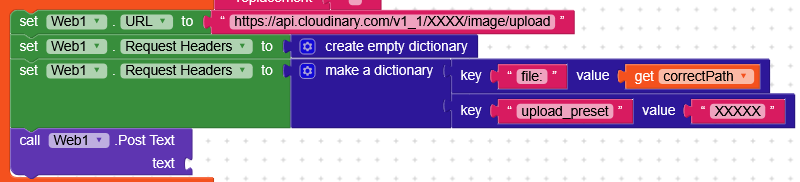 Set uploadURL to get "url" from jsonResponse (use the `JSONTextDecode` block)