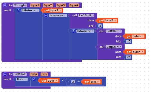 My problem arises when I want to send a similar structure back from the App. I can send an array of bytes by building a list with AppendToList blocks and sending it using BluetoothLE.WriteBytes. But How do I take a number and convert it to 4 bytes? The reverse of the CLongInt function written above. It will be something like this (Xojo)…