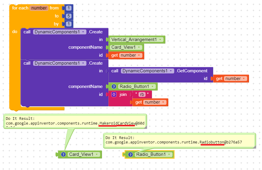 I can create card view using " create component" block.
