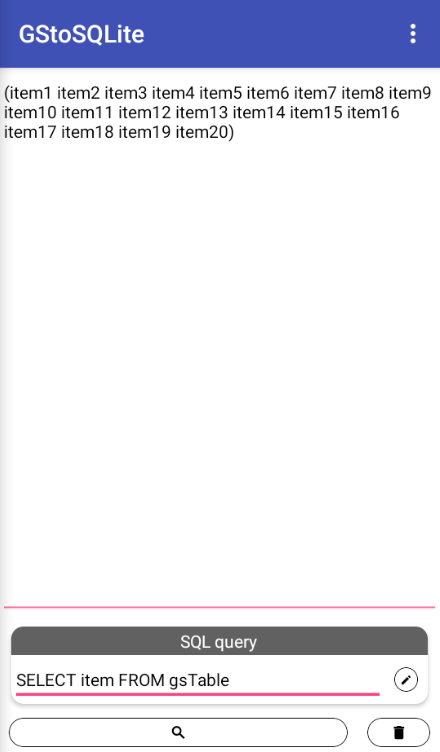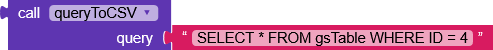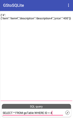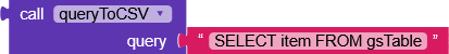 CREATE TABLE gsTable (id TEXT, item TEXT, description TEXT, price TEXT)