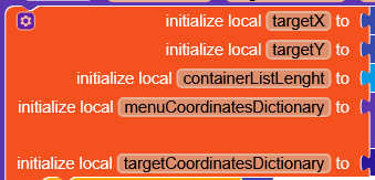 targetXandtargetYwill represent the X and Y position of our target in this case one of the buttons, we will later see how to calculate them. containerListLength: simply the length ofcontainerListmenuCoordinatesDictionary: callsgetCoordinatesDictionaryto obtain the menu’s coordinates.targetCoordinatesDictionary: We will obtain them later.