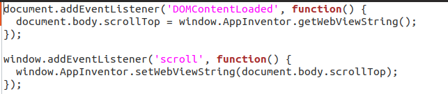 No runtime error but still not working what i want. What the javascript does is that it is giving the scrollposition in the html to the webviewstring block. But it is still not working.
