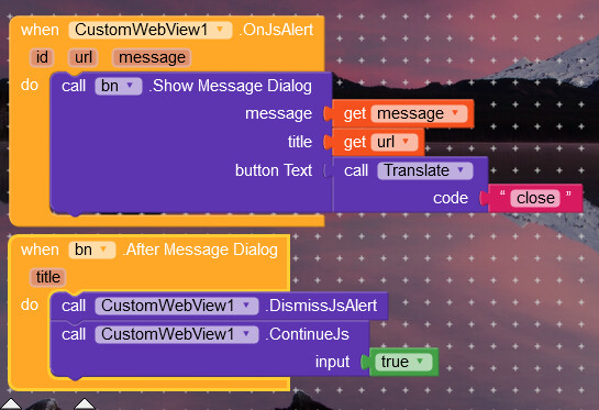 it shows alert but wont countine runing js after “dissmiss” or “countinejs”