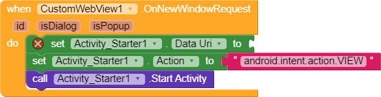 Hi, I’m using custom webview. I want to open social media links on website to open in social media apps, eg fb link in fb app. I am trying using activitystarter & onnewwindowrequest block as these links open in new window. Can anyone help me.