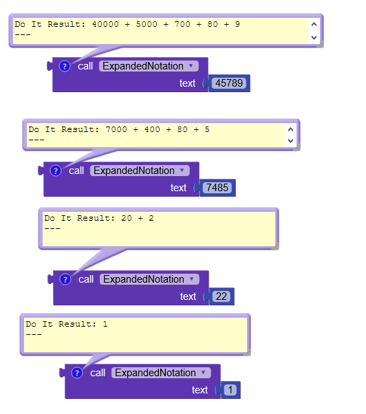 expand(5325) ➞ "5000 + 300 + 20 + 5"