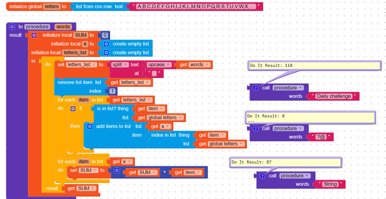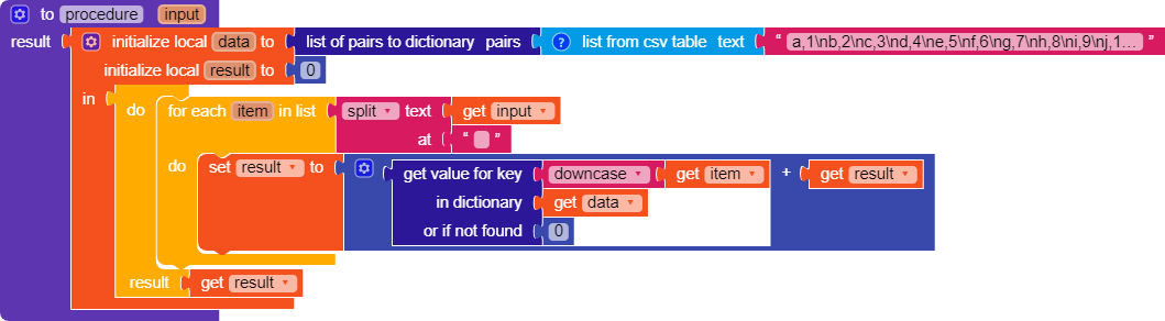 Create a procedure that you provide it a word and it will return the sum of all of its letters according to the numbers corresponding to the letters: