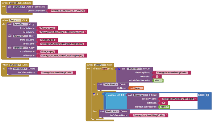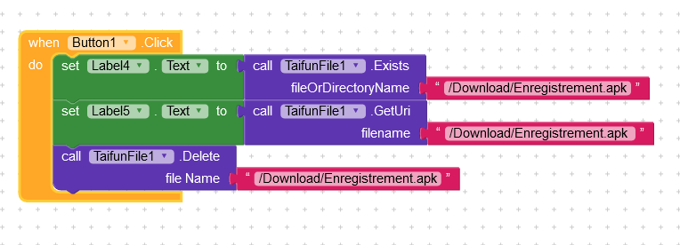 I want delete apk file on my phone (Android 7.0), after downloading it. I tried with Taiphun Files1 Extension: Block “Exist” = true, Block “Get Url” = “file:///Download/ … apk” , but Delete-file = no results. It seems Android permission is include in the extension block. I d’nt understand why it does not work. There is something I don’t do well ?